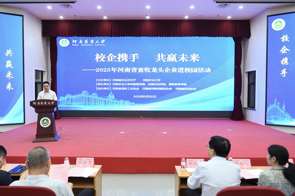 本网讯(通讯员 林智雅)5月26日,以“校企携手 共赢未来”为主题的2025年河南省畜牧龙头企业进校园活动在我校隆重举行。河南省农业农村厅总畜牧师张全勇、畜牧处处长王彦华、饲料兽药处处长胡赓,河南省动物保健品协会会长郑宝振、河南省饲料工业协会会长郑文革、河南省奶业协会秘书长陈华杰,我校副校长郭战伟、招生就业办公室副主任曾玲玲、动物医学院院长魏战勇、吃瓜网站