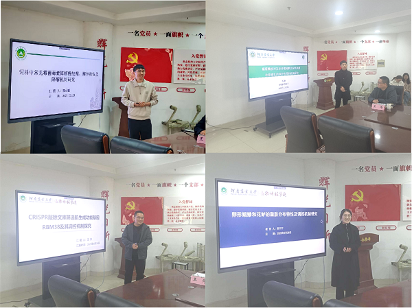 青年教师(博士后)郭永鹏、柏峻、王伟、苏宁宁分别以“饲料中常见霉菌毒素降解酶挖掘、酶学特性及降解机制研究”、“葡萄糖胺缓解玉米赤霉烯酮诱导的妊娠母体胚胎发育及胎盘功能的机制研究”、“CRISPR敲除文库筛选肌生成功能基因RBM38及其调控机制探究”和“卵形鲳鲹和花鲈的脂肪分布特性及调控机制研究”为题进行专题汇报分享。