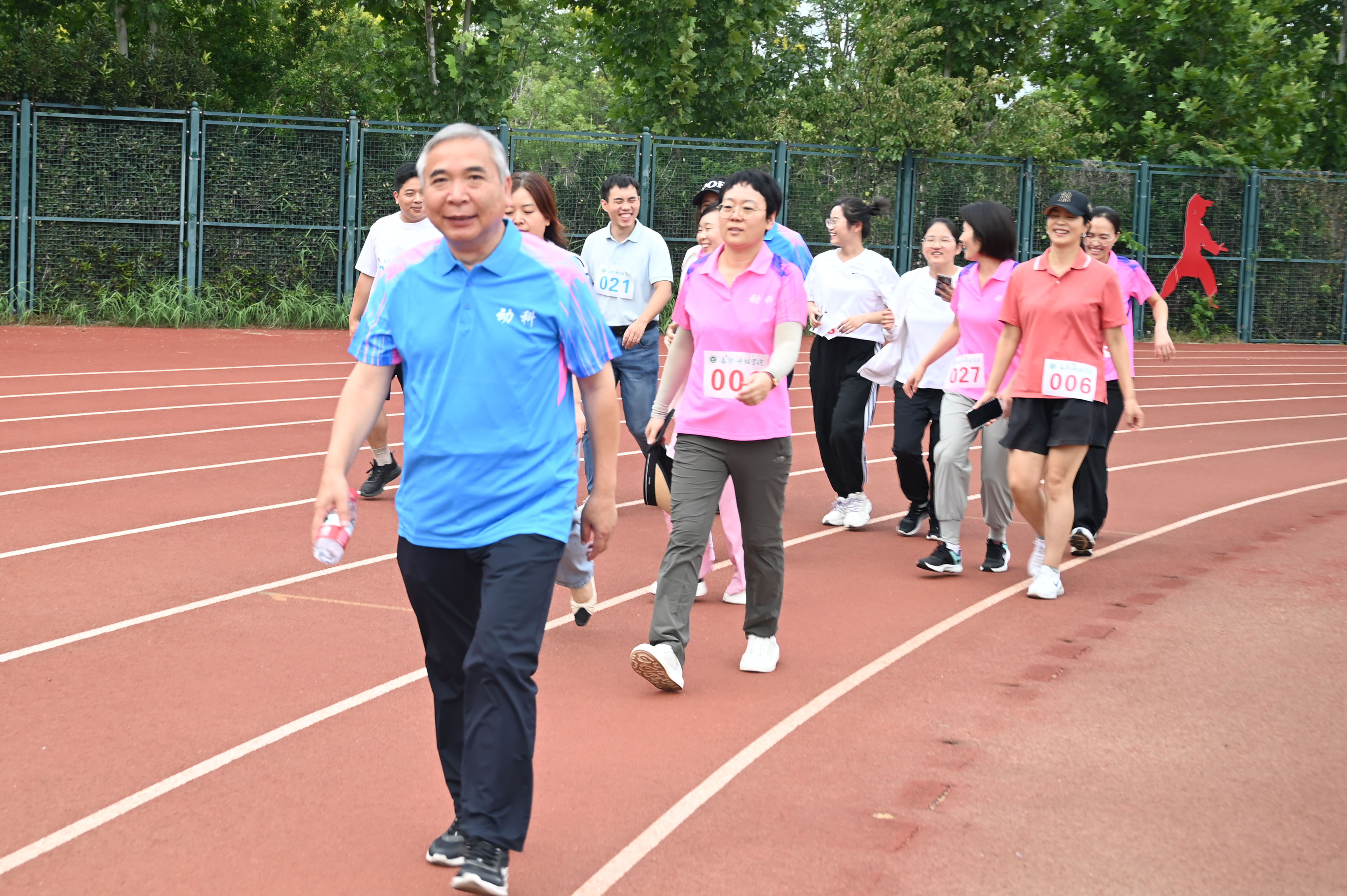 随着院长李明教授的一声哨响,比赛正式开始。在围绕操场10圈共4公里的赛程中,教师们个个神采奕奕,步伐轻快,他们或竞赛比拼,或结伴笑语,一路上分享着工作与生活的点滴喜悦。笑声与活力交织,尽显动科人昂扬向上的精神风貌。