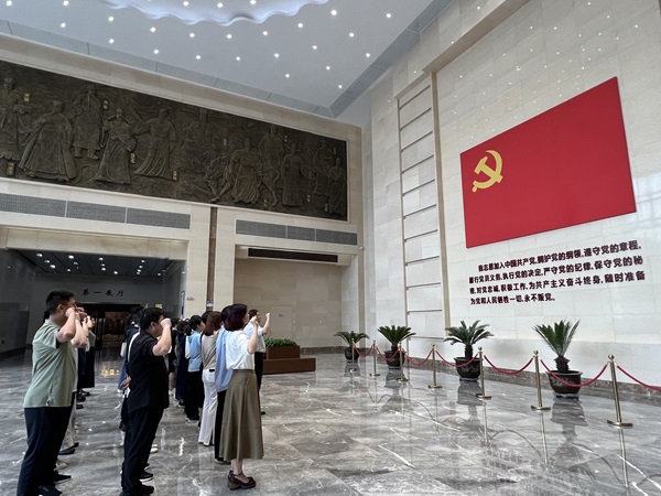 参观学习开始前,余磊带领全体教工党员进行宣誓,党员们面对鲜红的党旗,郑重肃立,高举右拳,以集体宣誓的方式重温入党誓词。