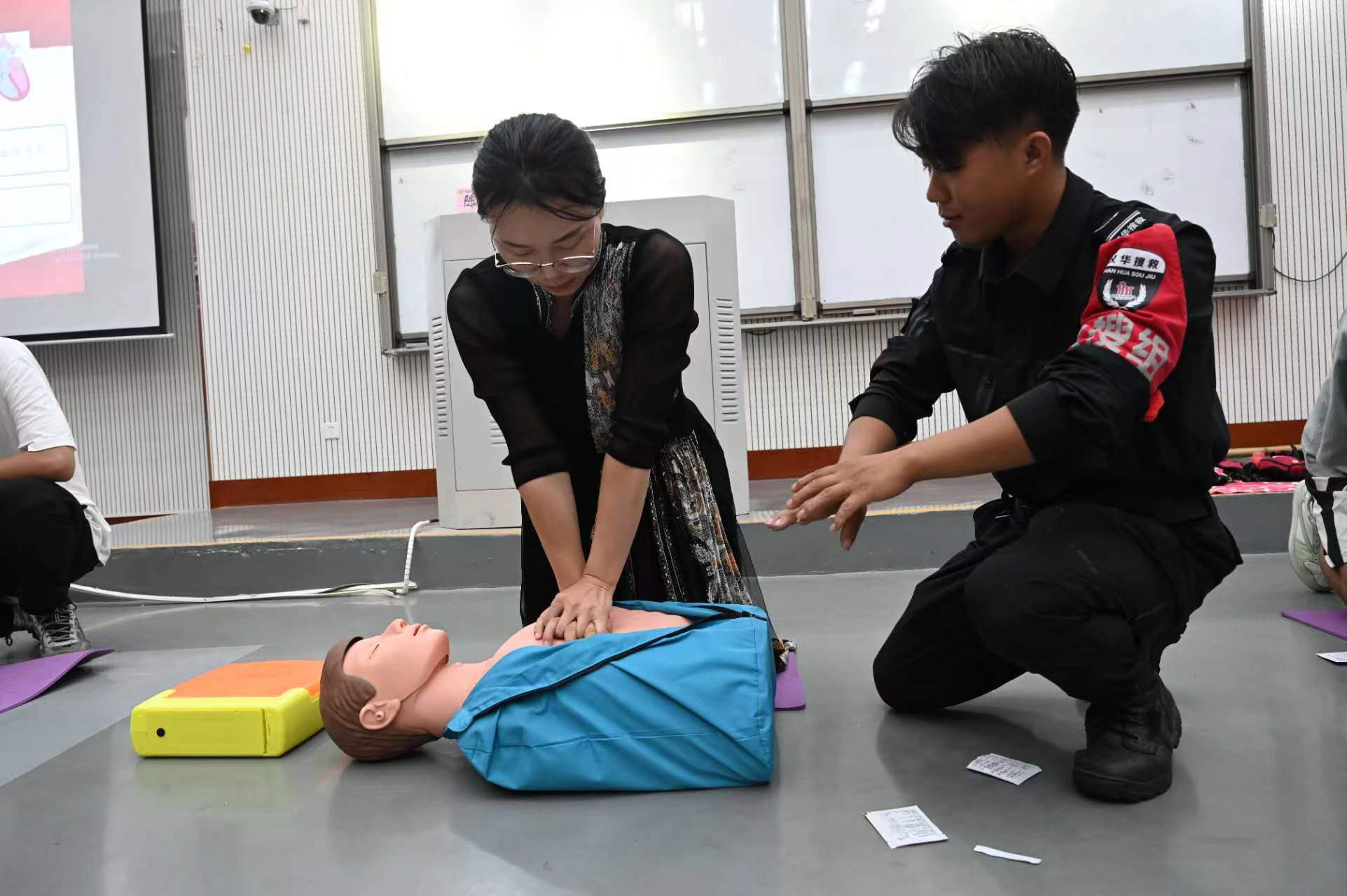 陈文龙以情景剧演绎和现场示范的形式,围绕心肺复苏、创伤救护、气道梗阻急救及AED自动体外除颤器操作等急救知识进行讲解,并结合经典急救案例进行操作示范,对具体操作要领进行强调。现场的学生热情高涨,积极互动。