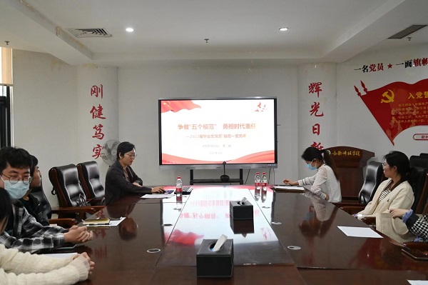 郭娟以《争做“五个模范”,勇担时代重任》为题,对习近平总书记在庆祝中国共产主义青年团成立100周年大会上发表重要讲话中勉励青年争做五个模范进行解读,希望毕业生党员要不忘初心,勇担时代重任,做理想远大、信念坚定的模范,做刻苦学习、锐意创新的模范,做敢于斗争、善于斗争的模范,做艰苦奋斗、无私奉献的模范,做崇德向善、严守纪律的模范,发挥先锋模范带头作用,在不同岗位上建功立业。