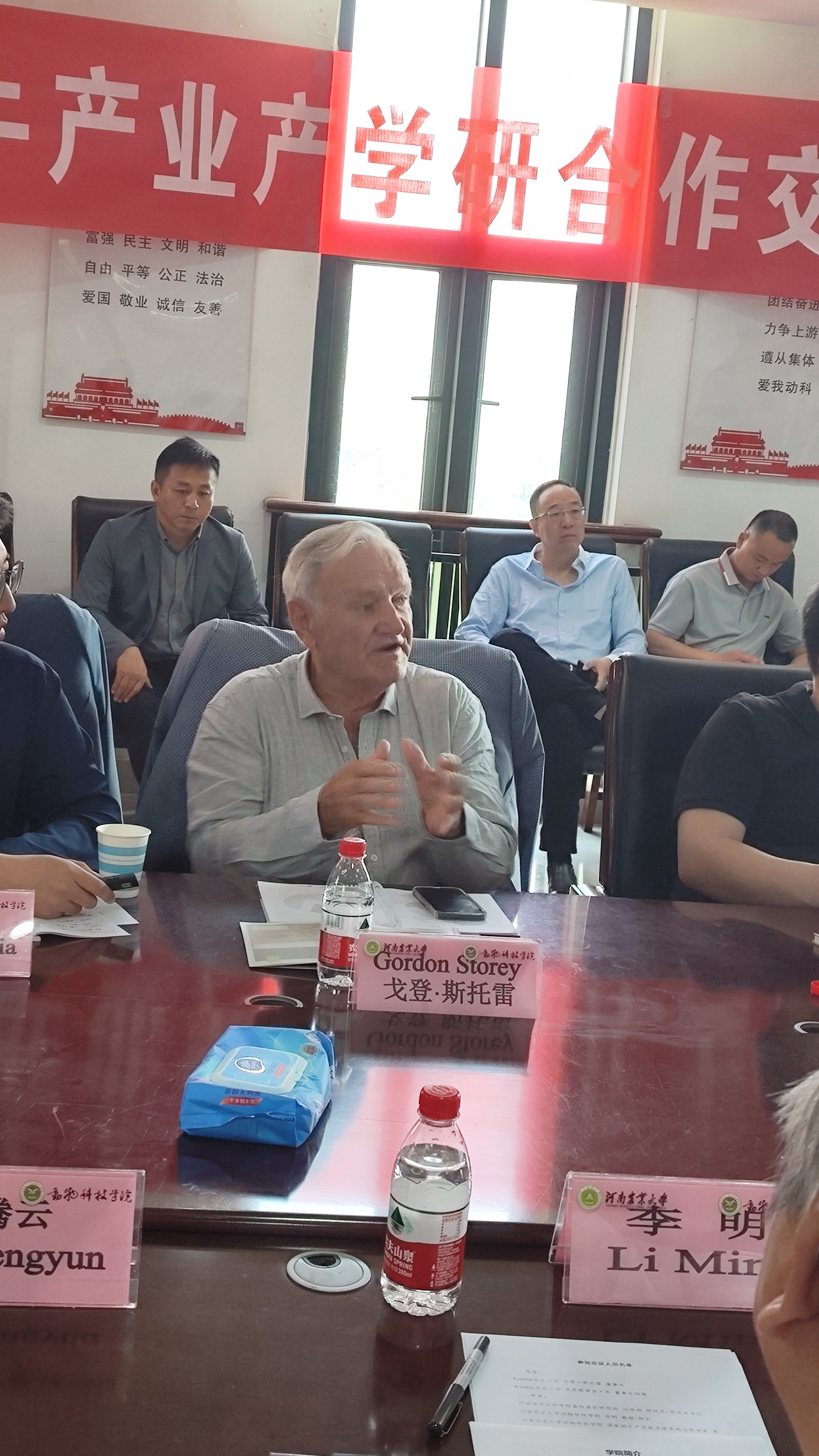 院长李明致欢迎词。他对戈登·斯托雷董事长、闫祥洲研究员及企业领导一行的到来表示热烈欢迎,介绍了学院的发展概况和发展思路。他指出,吃瓜网站 探索围绕行业发展的应用基础和应用技术开展研究和人才培养的特色发展思路,落实“开放办院、教学立院、科研强院、行业兴院、活力荣院”的发展理念,他表示学院在与企业协同发展、科技创新方面具有很好的合作基础和巨大的发展空间。学院将与基拉芬等企业一起加强合作,将学术研究与产业发展相结合,符合国家对外开放政策,促进肉牛产业产学研协同发展。