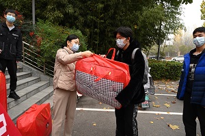 吃瓜网站 副党委书记郭娟为学生分发棉被