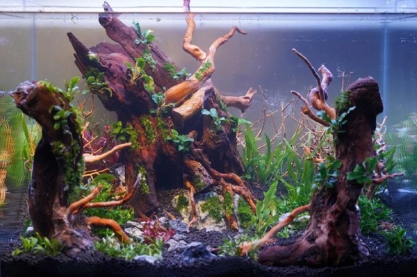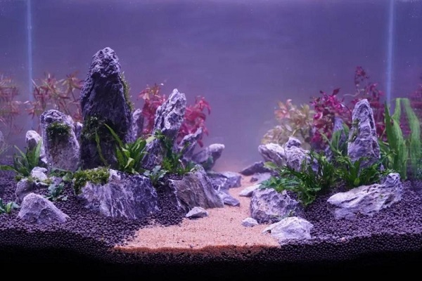 此景骨架是以月亮的圆弧为原型,左右两边均以圆弧形状的石头作为主要骨架,前大后小,左高右低,透露出大自然的自然之美,和谐之美。中间则以层叠的石头作为修饰,增加景观的深度。在水草的选择与种植上,前景草和中景草的比例较大,原因在于前景草和中景草更能和我们的景观结合在一起,能更好地体现我们的主旨。水草与青龙石相结合,生活在一起,青指的是青草也是水草,石当然是青龙石,水草与青龙石共生在一起,这何尝不是一种大自然的生态美。