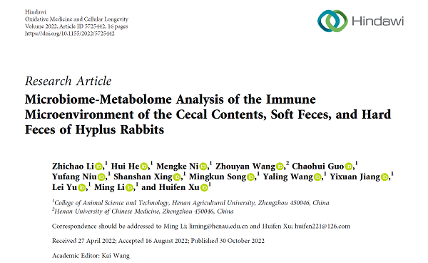本网讯(通讯员 许会芬)日前,吃瓜网站 李明教授科研团队通过多组学联合分析,探究了伊普吕兔盲肠容物、软粪和硬粪中免疫微环境的差异。微生物组和代谢组的结果发现,家兔的软粪中瘤胃菌属、毛螺旋菌属和克里斯滕森菌属含量丰富,并且丁酸的含量也较高,结果表明家兔可能是通过食粪行为获取更多的益生菌和短链脂肪酸,这对改善盲肠免疫微环境具有重要作用。10月30日,该成果在期刊Oxidative Medicine and Cellular Longevity(5年平均影响因子8.43)以Article形式在线发表。