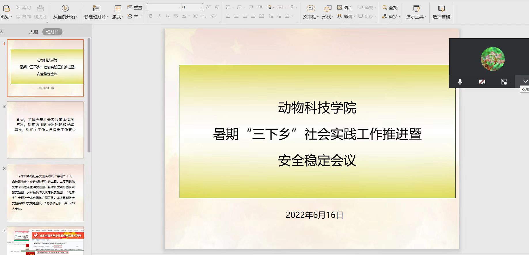 韩笑首先介绍了本次社会实践的进展情况,结合往年具体案例和今年工作实际,再次强调了社会实践这一长才干、做贡献的重要渠道,韩笑对前方实践团队提出了三点提醒:一要紧绷安全之弦,增强安全意识;二要紧扣实践主题,创新活动载体;三要紧贴需要服务,展现青春风采。通过活动中牢固树立安全意识,做好防疫措施,活动后及时总结,巩固实践成果,在实践服务中接受锻炼,经受考验,团结协作,展现动科学子风采。