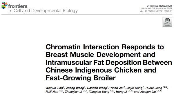 家禽团队刘小军教授在Frontiers in Cell and Developmental Biology(IF=6.684)杂志上发表题为Chromatin Interaction Responds to Breast Muscle Development and Intramuscular Fat Deposition Between Chinese Indigenous Chicken and Fast-Growing Broiler的论文。文章通过比较地方品种卢氏鸡和快大型AA肉鸡在三维基因组结构上的差异,首次揭示了染色质拓扑结构域(TAD)变化对鸡肌纤维发育和肌内脂肪(IMF)沉积的影响。