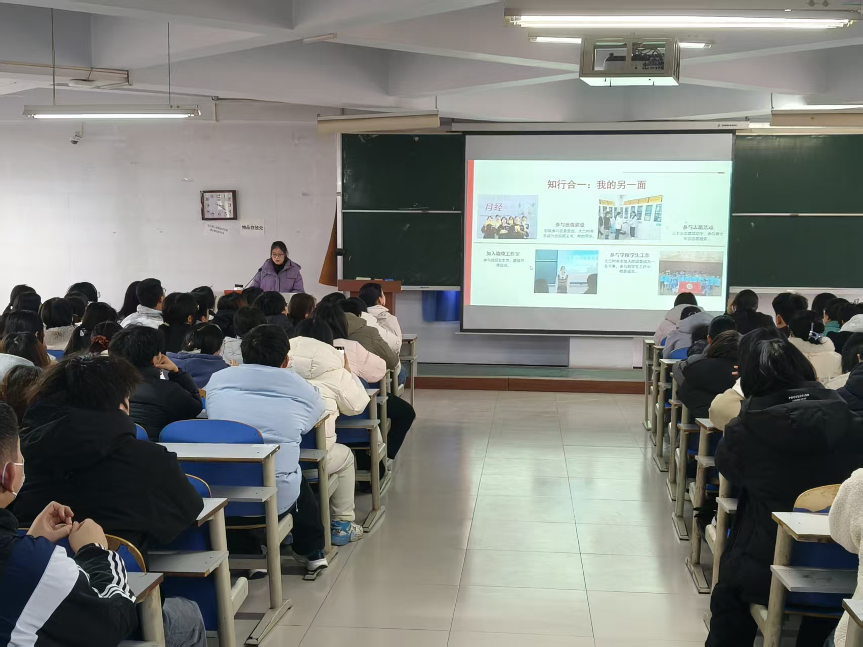 于文化路校区桃李园学生公寓桃西楼601召开国奖获奖学生经验分享会暨诚信考试主题讲座,本次活动由四位分享人及2025级全体本科生参与,辅导员郭明主持。