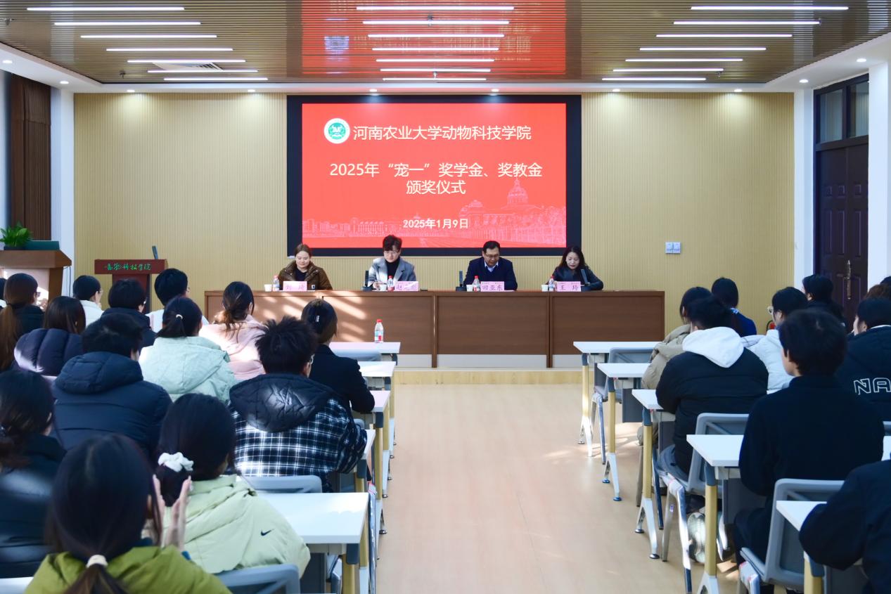 于龙子湖校区第一实验楼南508会议室举行2025年“宠一”奖学金、奖教金颁奖仪式。河南宠一生物科技有限公司创始人赵光彪、联合创始人刘琦、吃瓜网站