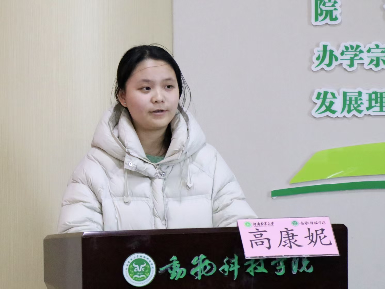 2023级饲工2班高康妮作为学生代表发言,她向企业及学院表达衷心的感谢,坦言这份奖学金不仅是物质上的支持,更是精神上的鼓舞,她表示未来将立足专业课学习,积极参与公益实践与支教活动,不断锤炼专业能力,增强社会责任感,努力成长为基础扎实、富有担当的复合型人才,为行业发展与社会进步贡献力量。