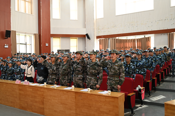 教官代表马宇龙结合PPT,从军训动员和军旅生活分享两大主题,向大家展示了军训工作安排、自身军旅生活,并分享了参军的人生感悟,他指出军训能够磨练学生团结、坚韧、爱国的优秀品质,希望同学们用心感受、享受军训过程。张耀杰、李金鹏带领全体学生庄严宣誓,充分激发了学生的爱国热情。