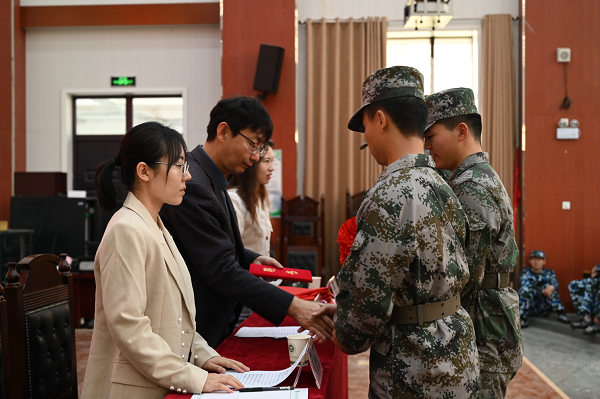 司雪萌和程浩师分别公布了21级、22级学生教官安排。由各排教官上台领取教官聘书,各排代表领取排旗。