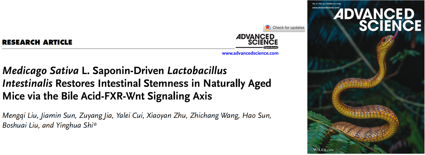 史莹华教授团队在中科院一区期刊《Advanced Science》(IF=14.1,IF5=15.6)在线发表了研究论文,题目为“Medicago Sativa L. Saponin-Driven Lactobacillus Intestinalis Restores Intestinal Stemness in Naturally Aged Mice via the Bile Acid-FXR-Wnt Signaling Axis”。该研究揭示了苜蓿皂苷通过特定肠道菌及其代谢物调控动物肠道干性缓解炎症延缓衰老的机制,为利用饲草功能性提取物保护肠道健康提供了新的视角,为饲草深加工产品的开发利用提供了新思路。