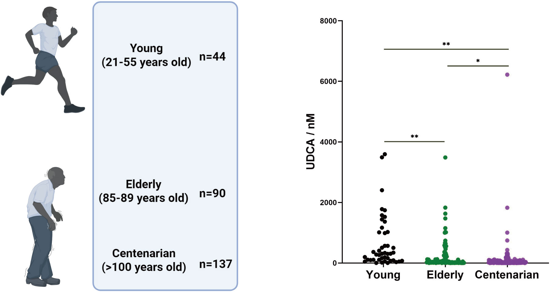 图3 年轻人群的粪便UDCA浓度显著高于老年人群