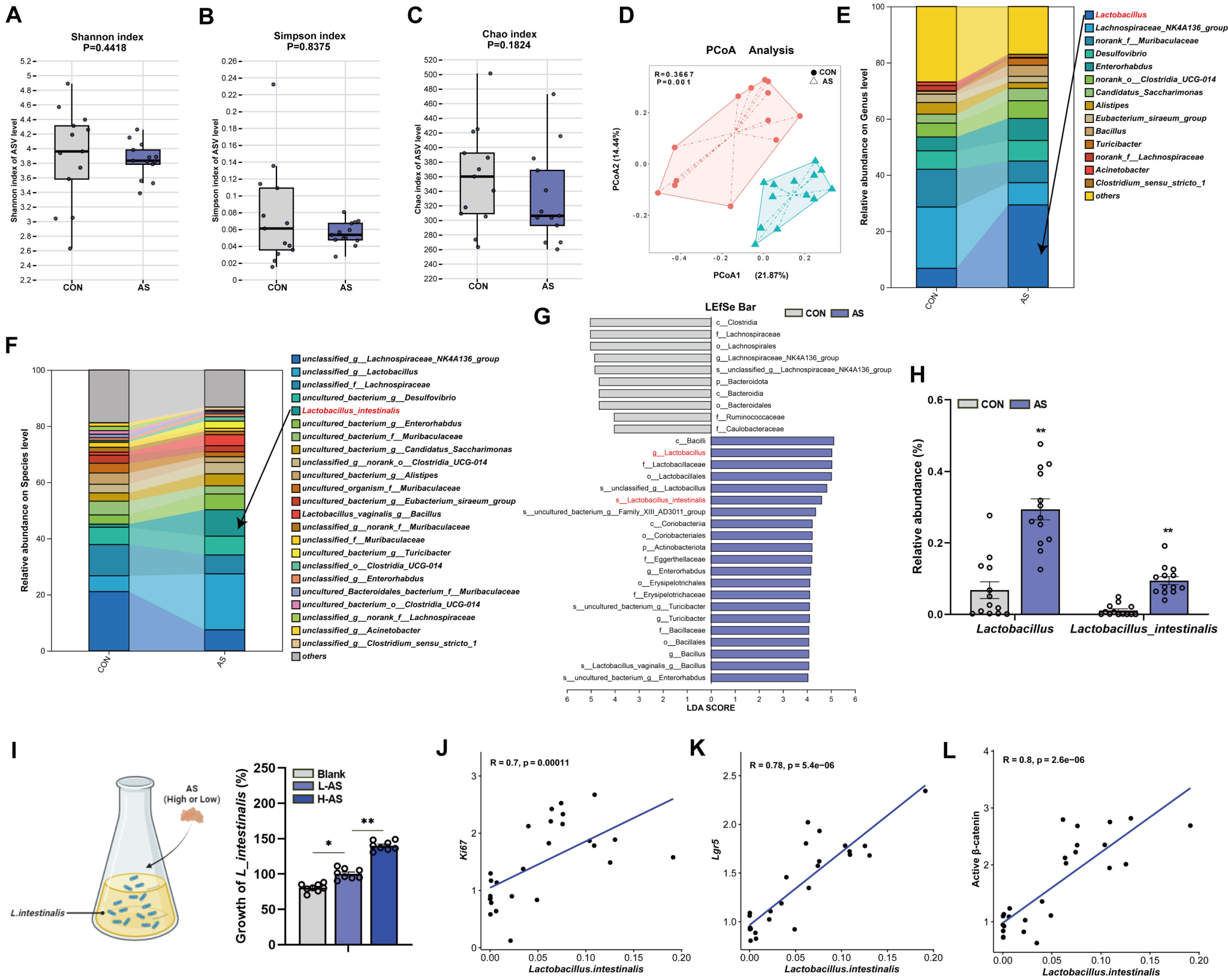 图2 AS重塑自然衰老小鼠肠道微生物群组成,并增加Lactobacillus intestinalis丰度