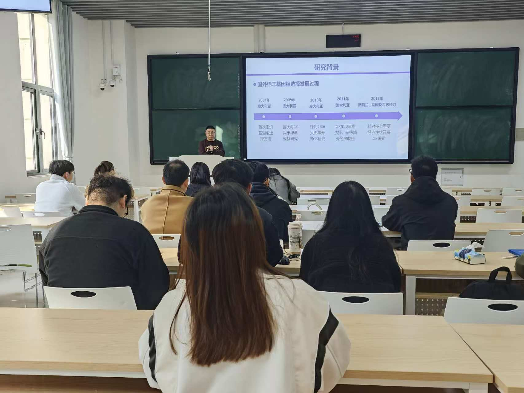 报告中,韩红兵副教授详细讲述了国外绵羊基因组选择发展过程以及不同性状的基因组选择。在基于澳洲白羊和杜泊羊群体通过复合的SNP分型方法,建立了大样本高密度标记面板、并通过比较不同基因组模型,证明基因组评估在绵羊育种中的优势以及基因编辑的迭代。韩红兵副教授在本场报告中为在场师生进行了一场关于“基因组选择育种”的精彩讲解。此次报告拓宽了我校师生的学术视野,也激发了大家对基因组选择育种的研究的兴趣。