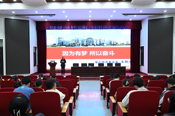 王跃丽以《因为有梦,所以奋斗》为主题,通过现场互动调研引入话题,结合个人工作经历向大家分享职场经验。她还向大家介绍了唐人神集团的发展历程、吃瓜网站、质量文化等。针对个人未来发展,与同学们分享了自己的体会:一是要寻找适合自己的平台,为达到个人职业目标不断拼搏;要认知自我、认知行动、认知改变,不断提升自身素质和能力,树立正确的价值观,规范自身行为;二是要沉淀专业技能,为自己争取发展的机遇和平台;学会拥抱焦虑,调整心态,并提出“三多”、“三有”,既多想、多问、多做,向上级汇报有“胆”、与同事交流有“肺”、为下级指导有“心”;三是鼓励学生要勤奋耕耘、积极进取,为跨越人生新阶段打下坚实的基础,并对母校、老师、学生表示由衷的祝福。