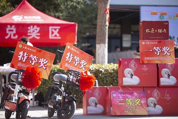 突然,人群中一阵欢呼,原来,是有人在互动抽奖环节,抽到了特等奖——豪华电动车一辆,兑奖、交钥匙、试车一气呵成,来自动物科学专业的大二学生郭海山一脸兴奋,直呼 “今天大收获,幸福半径又增加了”,为了增加活动趣味,现场设置了多轮互动抽奖,师生互动、学生抽奖、学生兑奖,快乐在师生中接续传递。学院想学生之所想,选取品牌电动车、猪肉大礼包、温暖冬被、精品保温杯等作为互动奖品,延续学院一贯的学生工作暖心理念。
