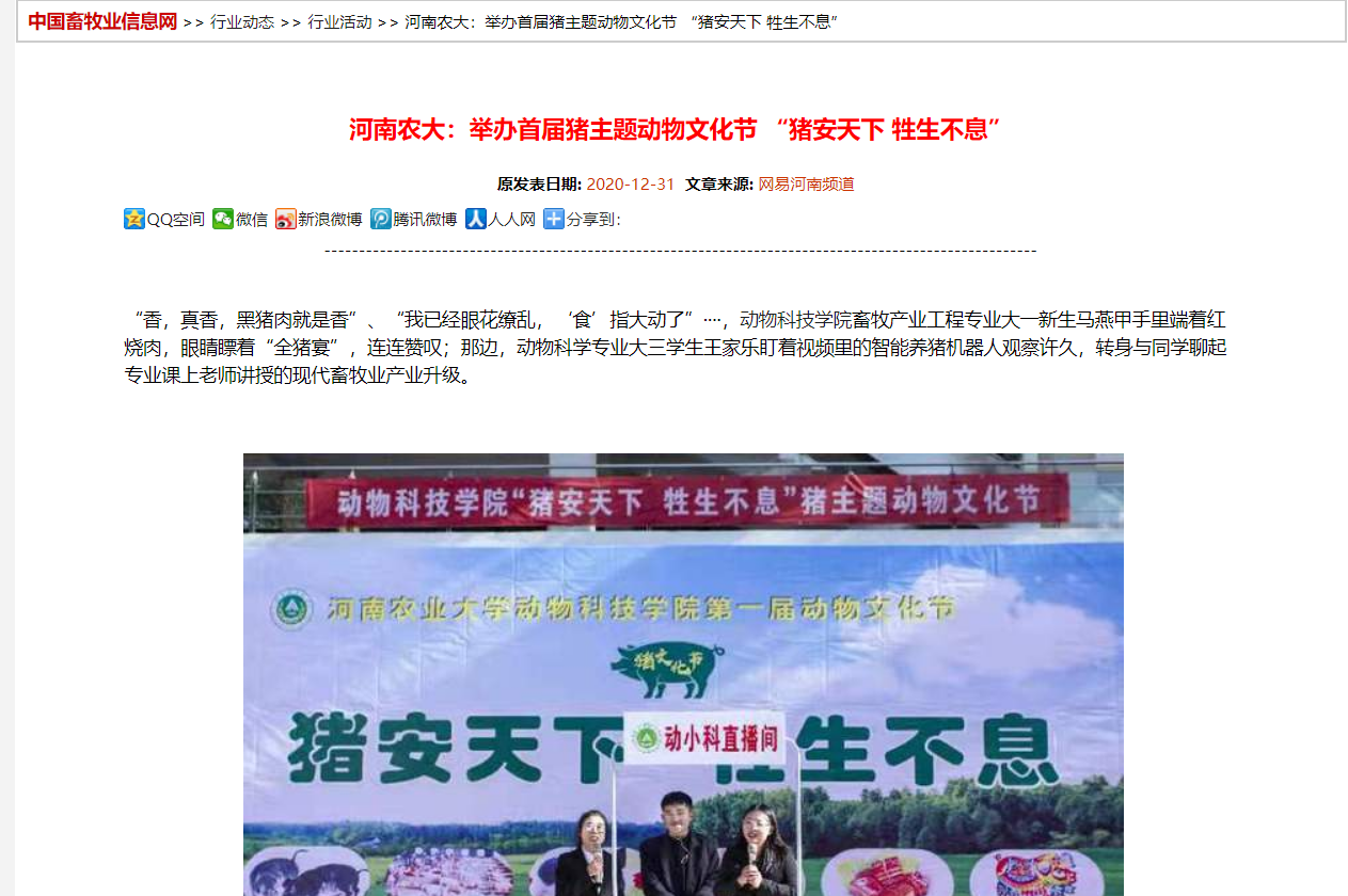 首届猪主题动物文化节,通过设置猪文化、猪高科技、猪肉制品(全猪宴)三大展区,主场文体演出、有奖猜谜、互动抽奖等五大活动,旨在从学生的兴趣点出发,在传承中华民族传统文化的同时,科普基础的动物文化和现代高科技养殖技术,让学生有滋有味尝美食,有声有色学知识,理清思想困惑,明晰专业目标,把“学农、知农、爱农、弘农”的使命扛在肩上,也为学院畅通校企合作渠道,搭建学生实习实验实训的“三实”教育平台、主动对接人才培养需求打下坚实基础。。